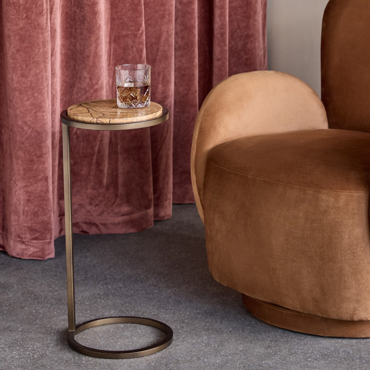 The Iota Side Table in Brown Emperador combines a beautiful, warm Italian marble top with natural veining and a sturdy, brushed smoked gold metal base. Its unique marble surface adds a touch of elegance to any room, while the solid construction ensures lasting stability.