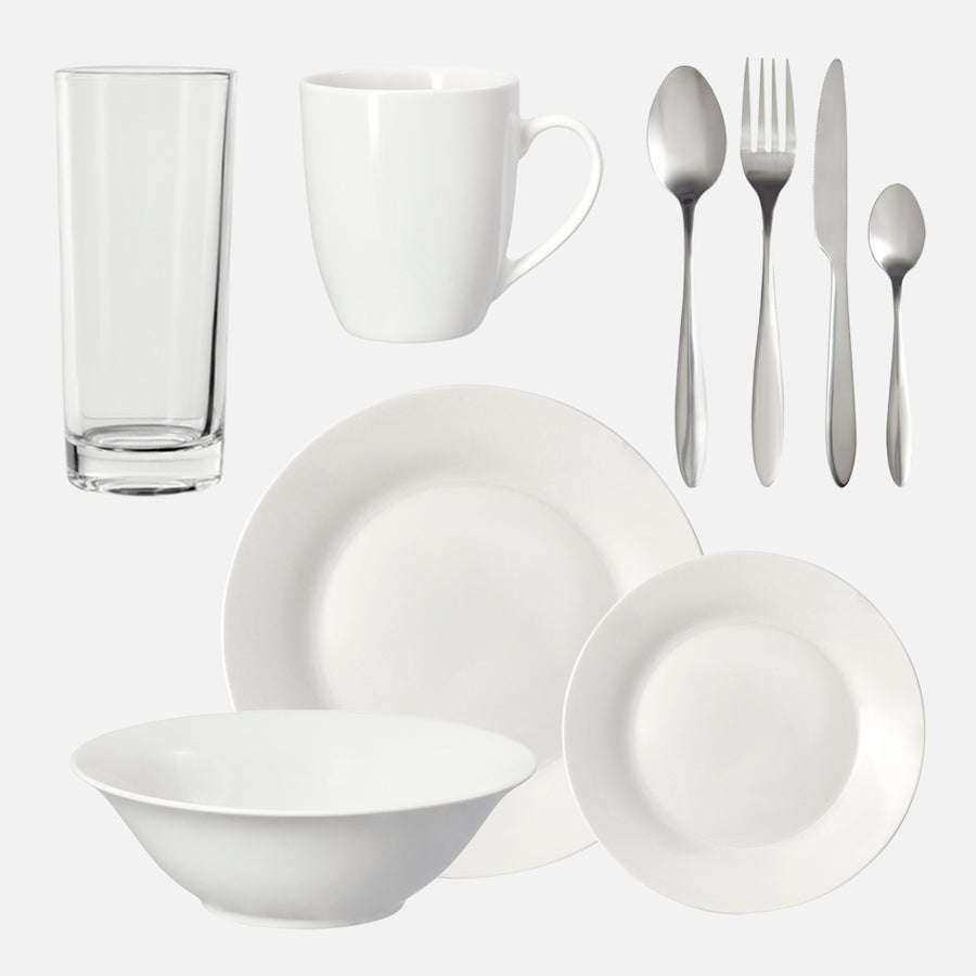 Knife, Fork, Tablespoon, Teaspoon, Dinner Plate, Side Plate, Cereal Bowl, Mug and Glass Tumbler